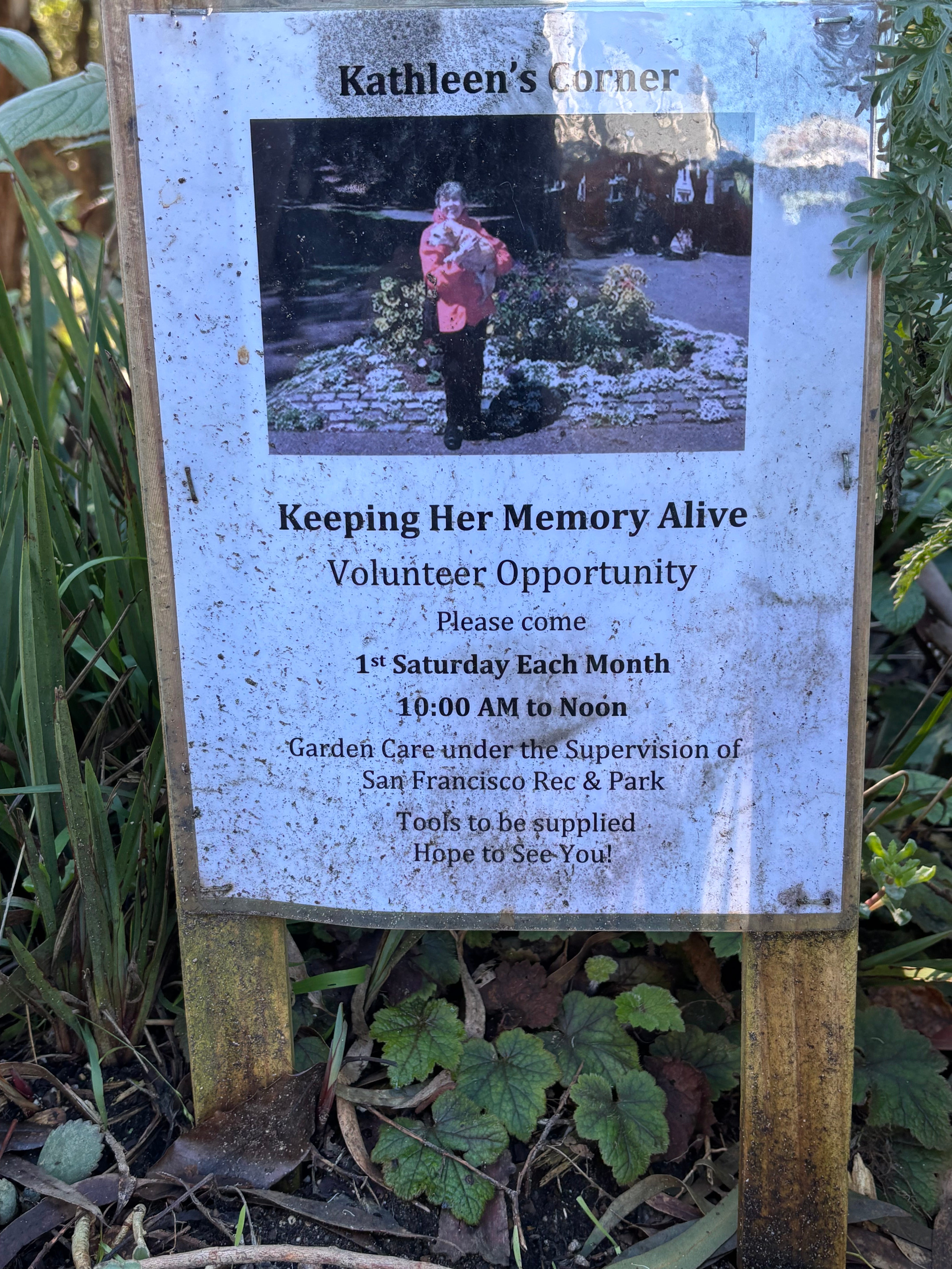I made my first visit to Kathleen’s Corner with Tièche in late December. The volunteers had decorated it for the holidays with evergreen garlands on the bench and a nutcracker statue on the island. Tièche was distraught to see that something — the recent storms or vandalism — had knocked down the pink-blossomed mallow bush since she stopped by the garden earlier that morning. She called a Rec and Park Gardner to help her cut it back and stake what remained.