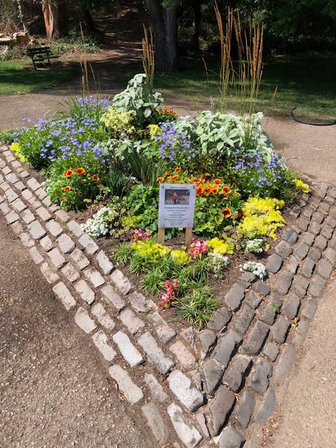 They planted a sign on the island announcing it as “Kathleen’s Corner” and began monthly work parties to keep the garden going. (They meet the first Saturday of each month from 10-12 and all are welcome.)