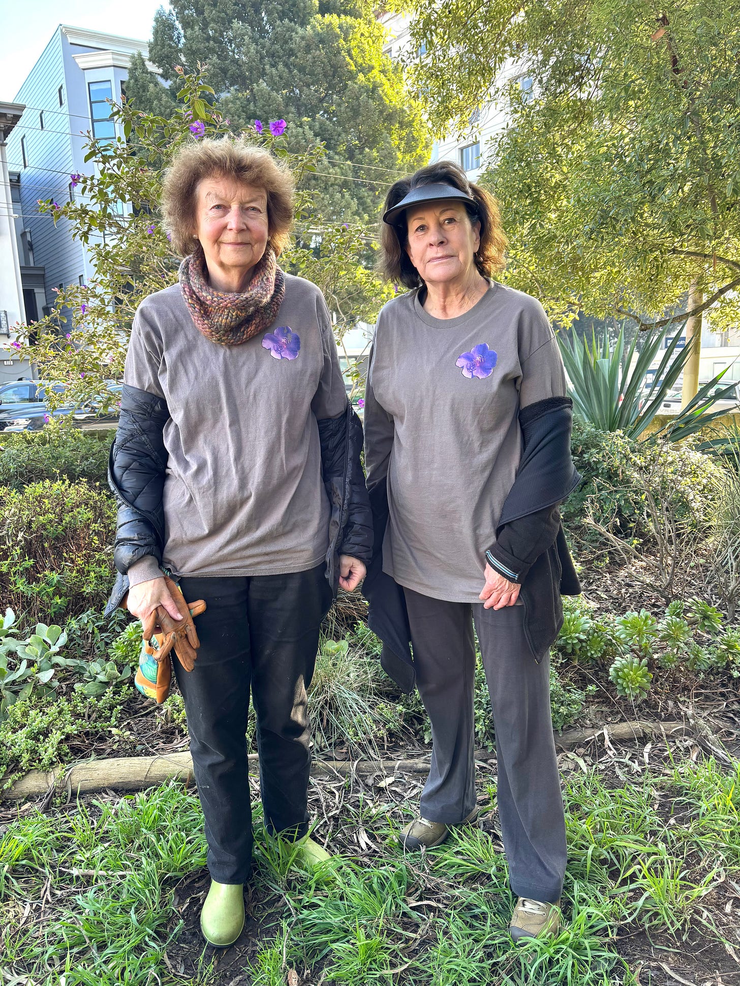 In 2018, Russell died at the age of 86. Friends gathered in the park for her memorial. The next day four of them decided they would adopt the corner and continue her work. The group included Tièche; Kubick, a long-time friend of Russell’s from their days working as nurses; and Elise Somerville, who got to know Russell because they both walked their dogs in the Panhandle. They didn’t really know each other before Russell’s death, but carrying on her legacy has turned them into friends.